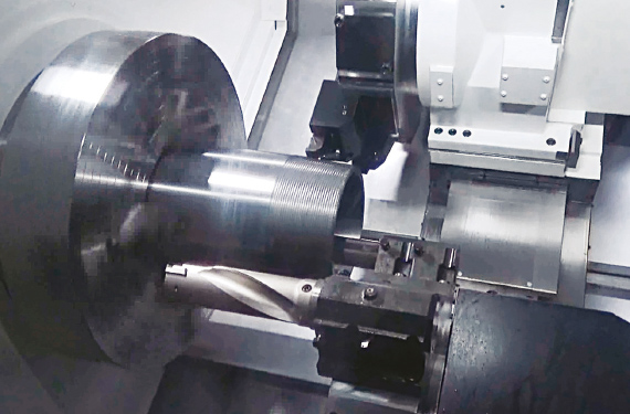 內(nèi)外徑同步切削 通過4軸同步控制,并使用上下刀架實現(xiàn)了外徑螺紋加工和內(nèi)徑鏜孔的高效率加工。 縮短了大口徑管等的大型工件的加工時間。 ![]() |