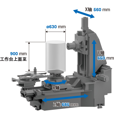 大工件尺寸 ø630mm × 900mm(升級原有機型) 注:僅限標準2面APC規(guī)格 大刀具長度 450mm(升級原有機型) |