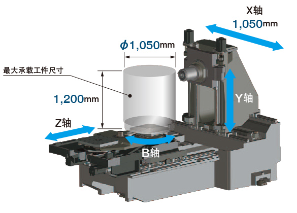 加工區域 X軸移動量:1,050mm(原有機型進化) Y軸移動量:900mm Z軸移動量:1,000mm 大承載工件尺寸 ø1,050×1,200mm※1、※2(原有機型進化) ※1:僅限標準2面APC規格 ※2:大工件直徑為ø1,000mm,距托盤上面120mm的高度。 大刀具長度 630mm※3(特殊規格)(原有機型進化) ※3:僅限鏈式刀庫 |