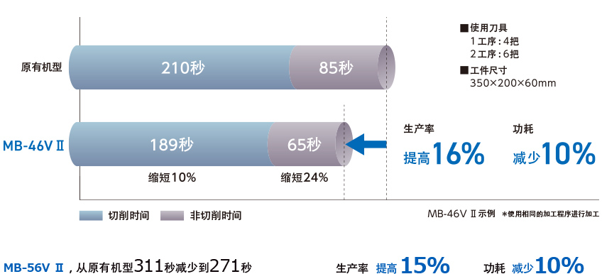 通過提高進給軸的加速度可以縮短切削時間,通過提高快速進給速度和縮短換刀等操作時間,可以縮短加工時間。因縮短加工時間,同時提高生產率,縮短的時間可用于其他工作。此外,還降低加工所需的功耗。