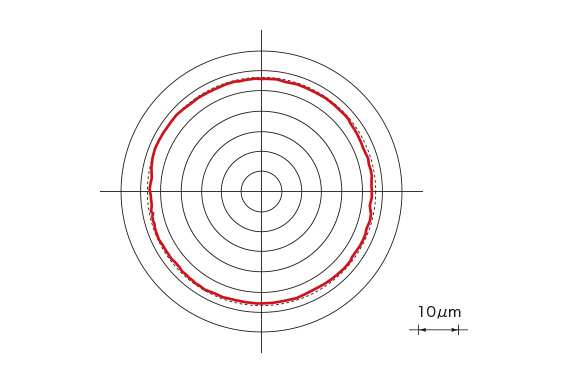 ■圓度 1.65μm(實測值) ?加工機床:MB-56VA ?外徑:ø150mm ?材料:Al ?主軸轉速:8,000min-1 ?進給速度:2,000mm/min ![]() |